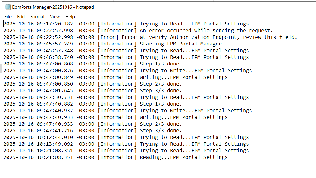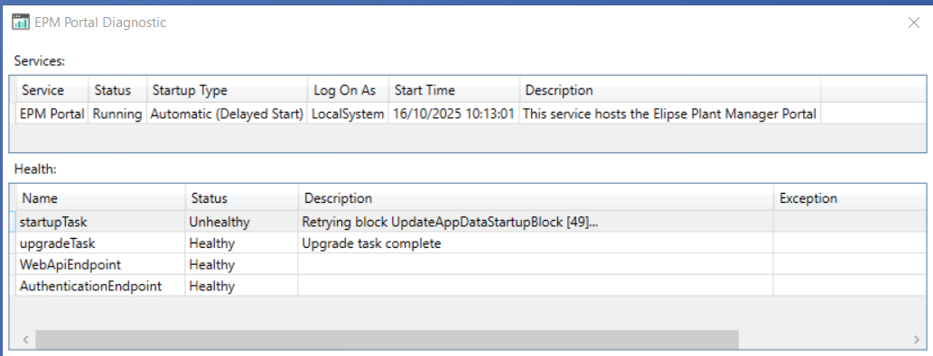 O Web Server está ok, consigo fazer o uso da biblioteca python epmwebapi e realizar a aquisição de dados por ela. Parece que o problema ocorre unicamente na inicialização do EPM Portal: